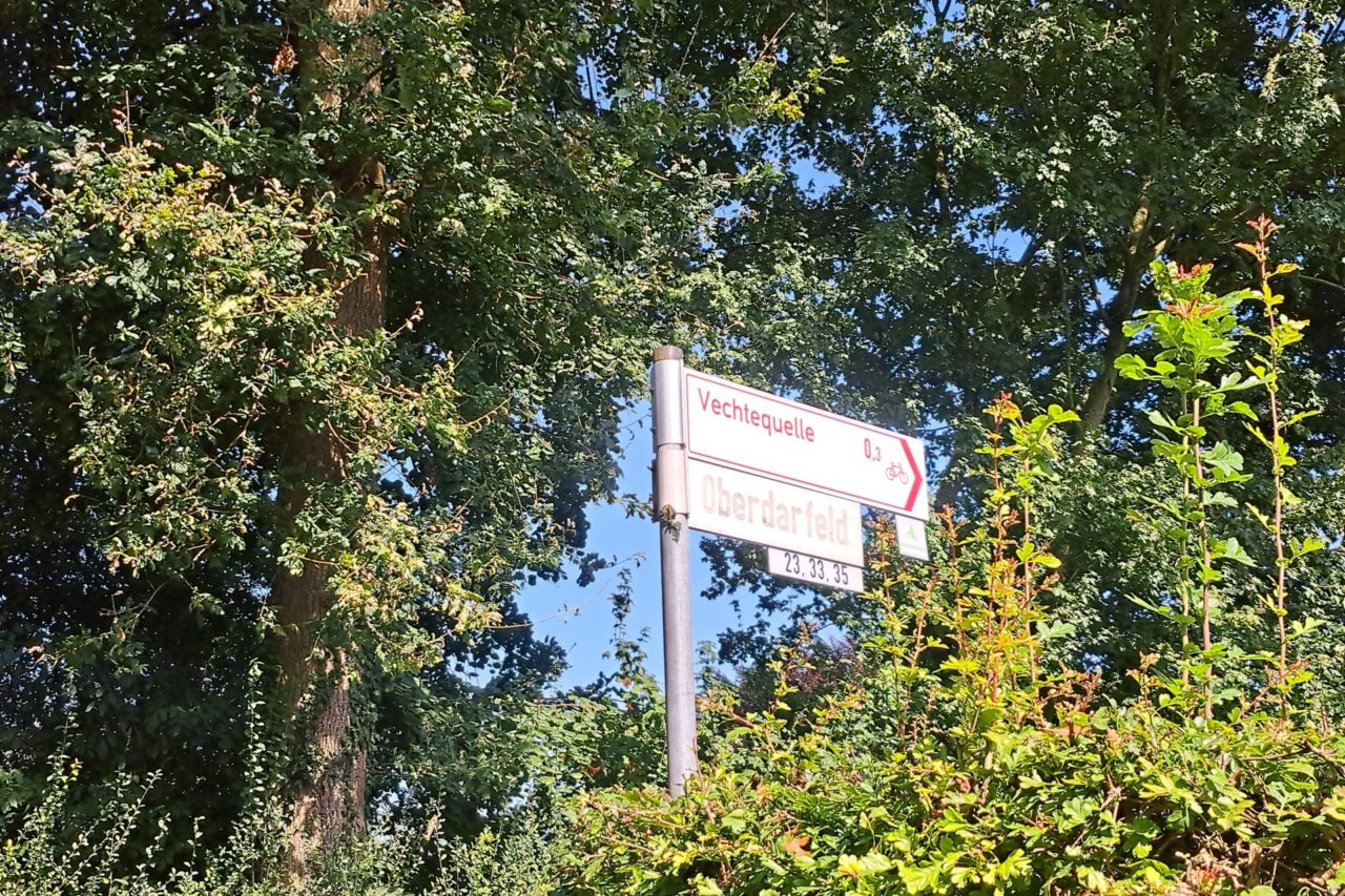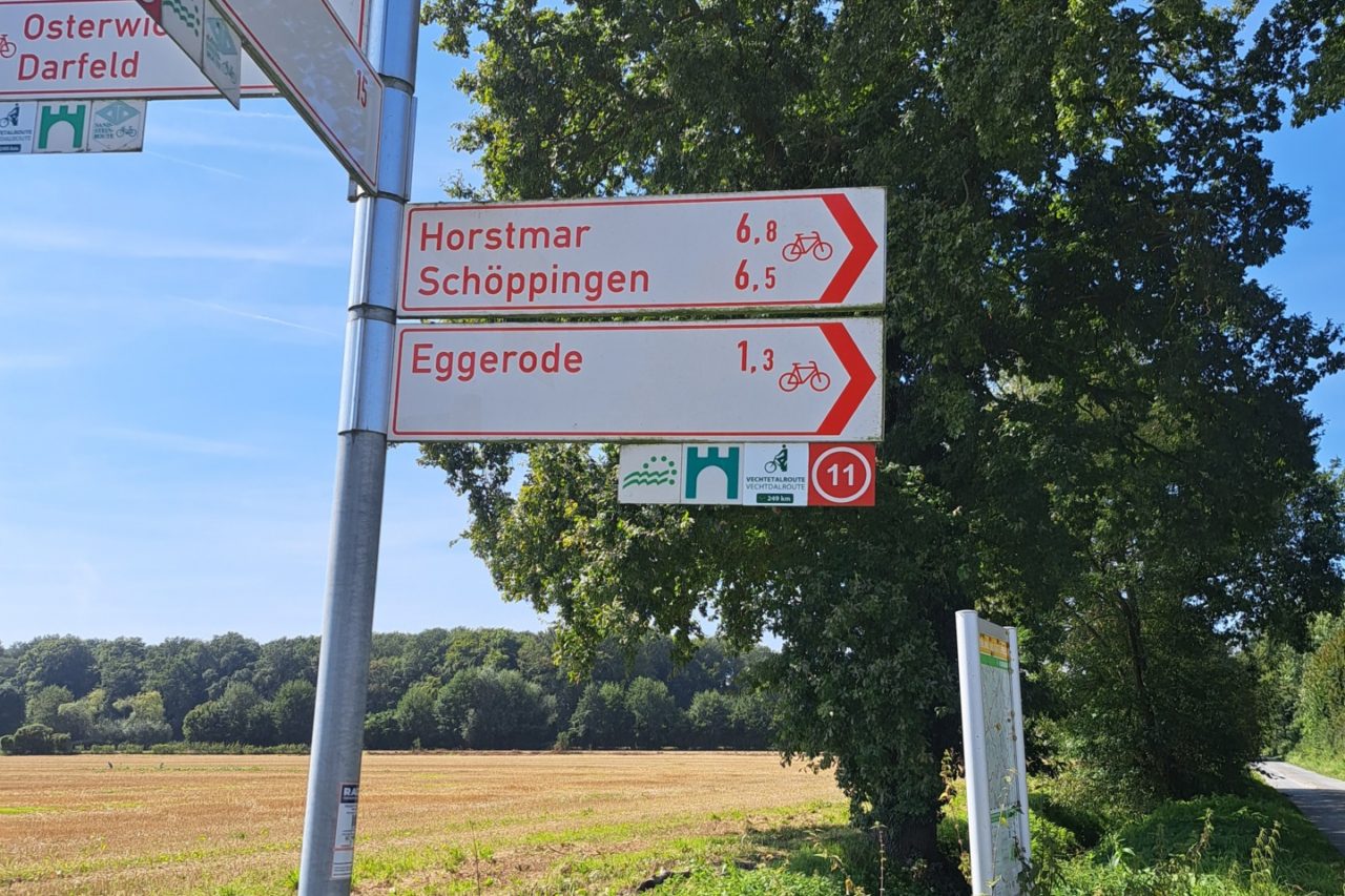 Zodra we het Münsterland uitrijden en het Grafschaft Bentheim binnen fietsen zijn alle “Roomsche objecten” als een donderslag bij heldere hemel verdwenen. Dit is een overwegend protestantse streek. Tijdens de Dertigjarige Oorlog van 1618 tot 1648 lag hier de frontlijn tussen de katholieken en protestanten. Een ander verschil is dat de fietswegwijzers nu ineens groen zijn in plaats van rood.