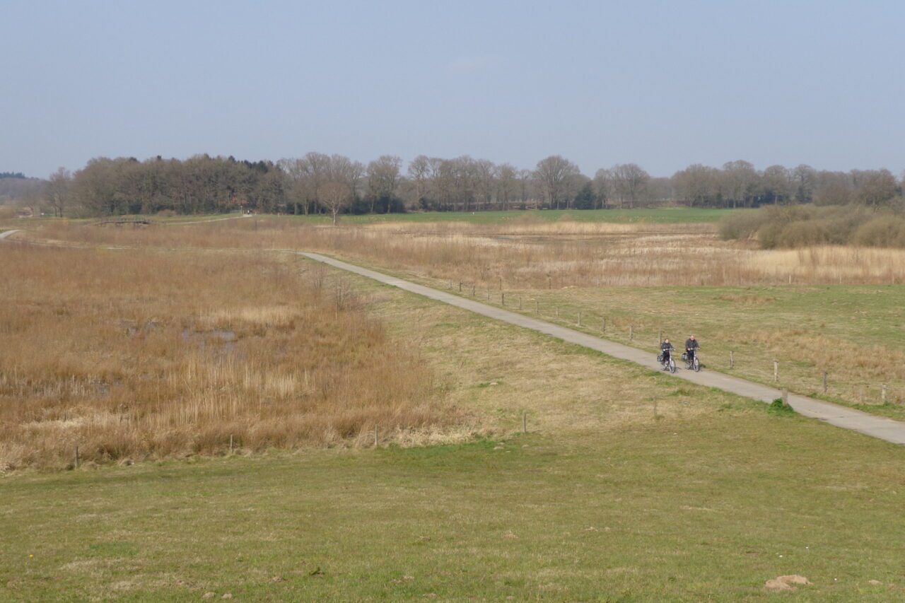 We lopen even naar de top van de uitkijkheuvel Distelbelt voor een blik over de nieuw gegraven meander de Mölnmarsch. Deze meander is gekomen om het natuurlijke karakter van de Vecht te herstellen, maar ook als overloopgebied bij hoge waterstand. De kunstmatige heuvel waar we op staan is gemaakt met het afgegraven zand voor de meander.