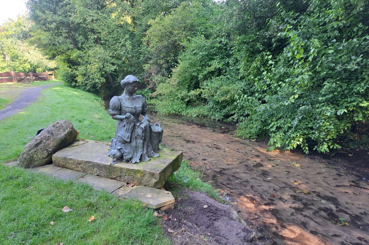 Uit een gat onder het dichte struikgewas komt ineens de Vecht te voorschijn. Genietend van de vrijheid kabbelt het water er lustig op los. Een kunstobject laat zien dat het stroompje ideaal was om de was te doen. De Vecht loopt echt door een dal aan de voet van de Baumberg: het hoogste punt van de omgeving. In het verleden zorgden watermolens voor het zagen van hout en het malen van graankorrels tot meel. We komen er nog een paar exemplaren tegen.