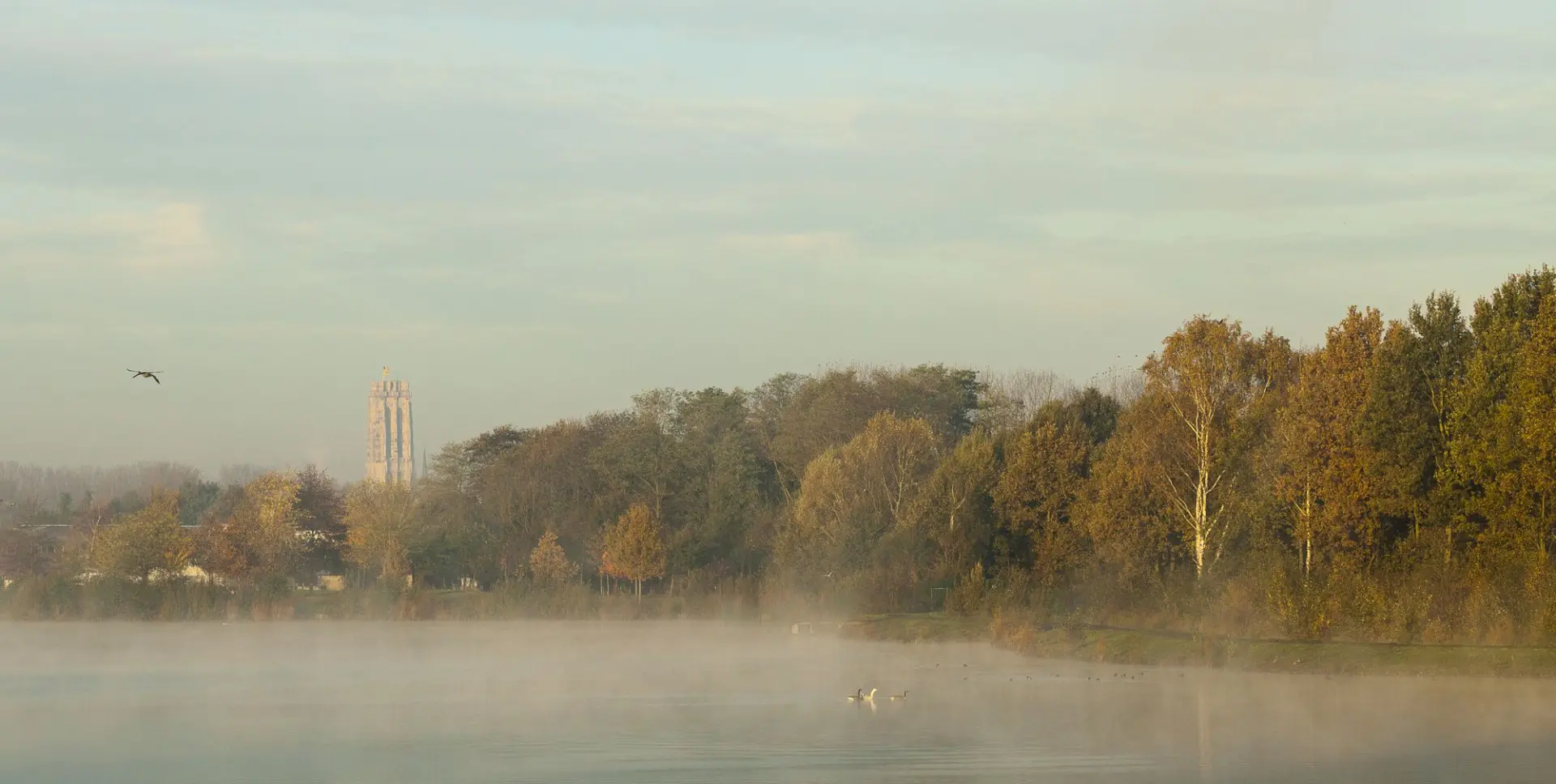 We fietsen Mechelen uit langs de Dijle naar het oosten. Het plassengebied De Nekker is een belangrijk recreatiegebied voor de stad. We zien ook hier duidelijk de sporen van de getijverschillen in de Dijle. Een grote stuw moet het nietige riviertje in toom houden, maar na veelvuldige regenval is de Dijle niet zo niet meer klein. Bij de Kerktoren van Muizen slaan we van de rivier af door het Mechels Broek. Dit moeras was vroeger een overstromingsgebied van de Dijle. Vogelaars staan met hun kijkers en telelenzen in de aanslag