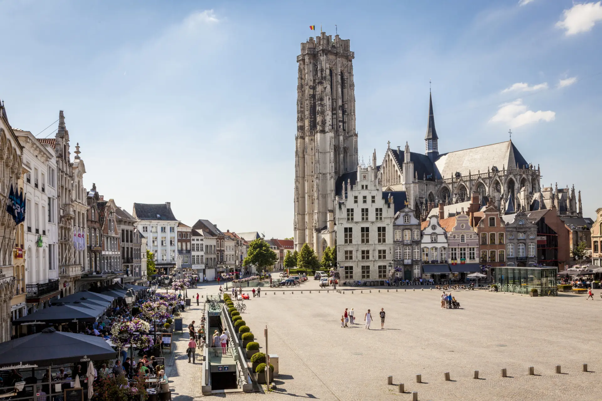 Aan de voet de toren en de kathedraal strekt zich de charmante Grote Markt uit: het kloppend hart van Mechelen. Op de vele terrassen is het aangenaam toeven.