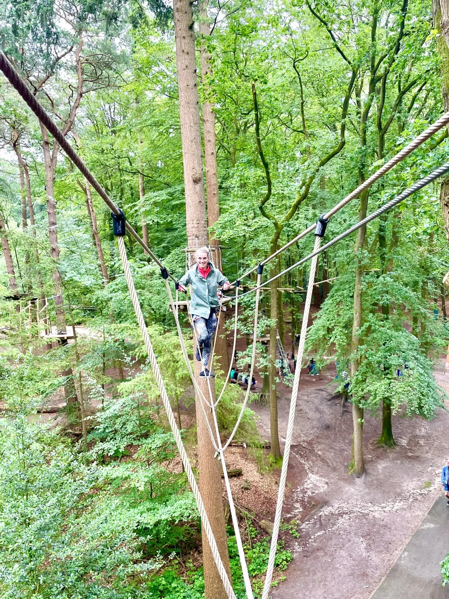 Ideaal is dat alle activiteiten vlakbij elkaar liggen. We lunchen bij De Jongens van Outdoor en gaan daarna direct door naar het Klimbos. Dit klimbos ligt op 2 minuten lopen en biedt verschillende parcoursen voor alle niveaus. Na de uitleg hoe je jezelf steeds op de juiste manier zekert, leggen we meerdere parcoursen af met klimmen en tokkelen.