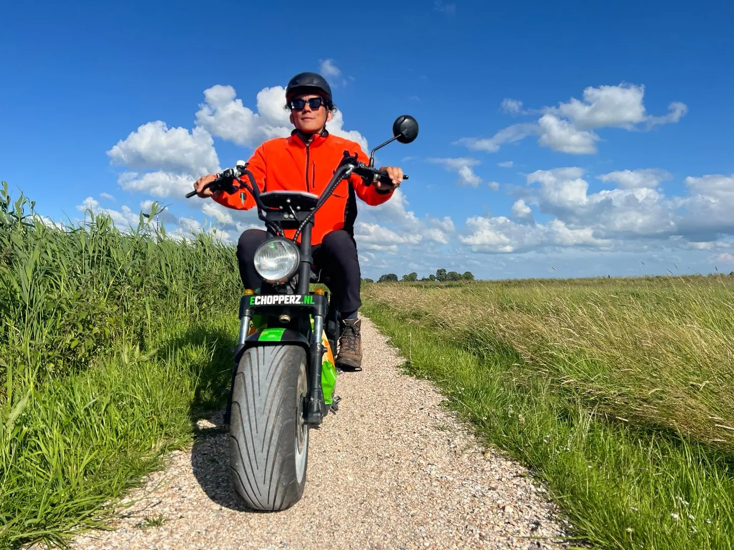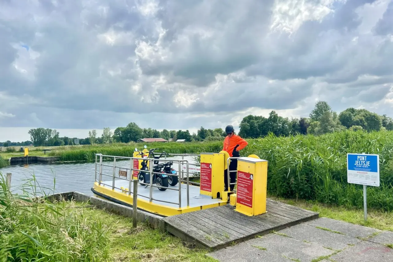 Na een korte uitleg (iedereen met een rijbewijs mag erop) zetten we ons helmpje op en gaan we op pad. We rijden de Fietsroute E-Chopper turfroute van ongeveer 31 kilometer. Heerlijk toeren door het vlakke land en over smalle paadjes. Onderweg komen we een pontje tegen dat je met de hand bedient. Boek je eigen E-chopper bij Echopperz, ook op andere plekken in Friesland.