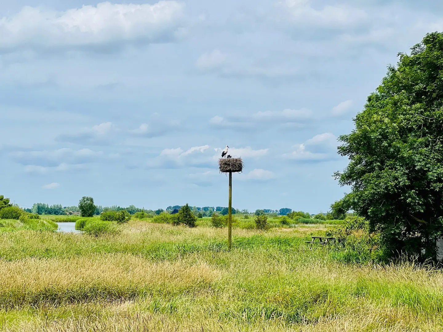 De route loopt namelijk over een fietspad langs het riviertje de Lende. Heerlijk rustig en prachtige uitzichten. Bovendien zien (en horen!) we veel ooievaars onderweg.