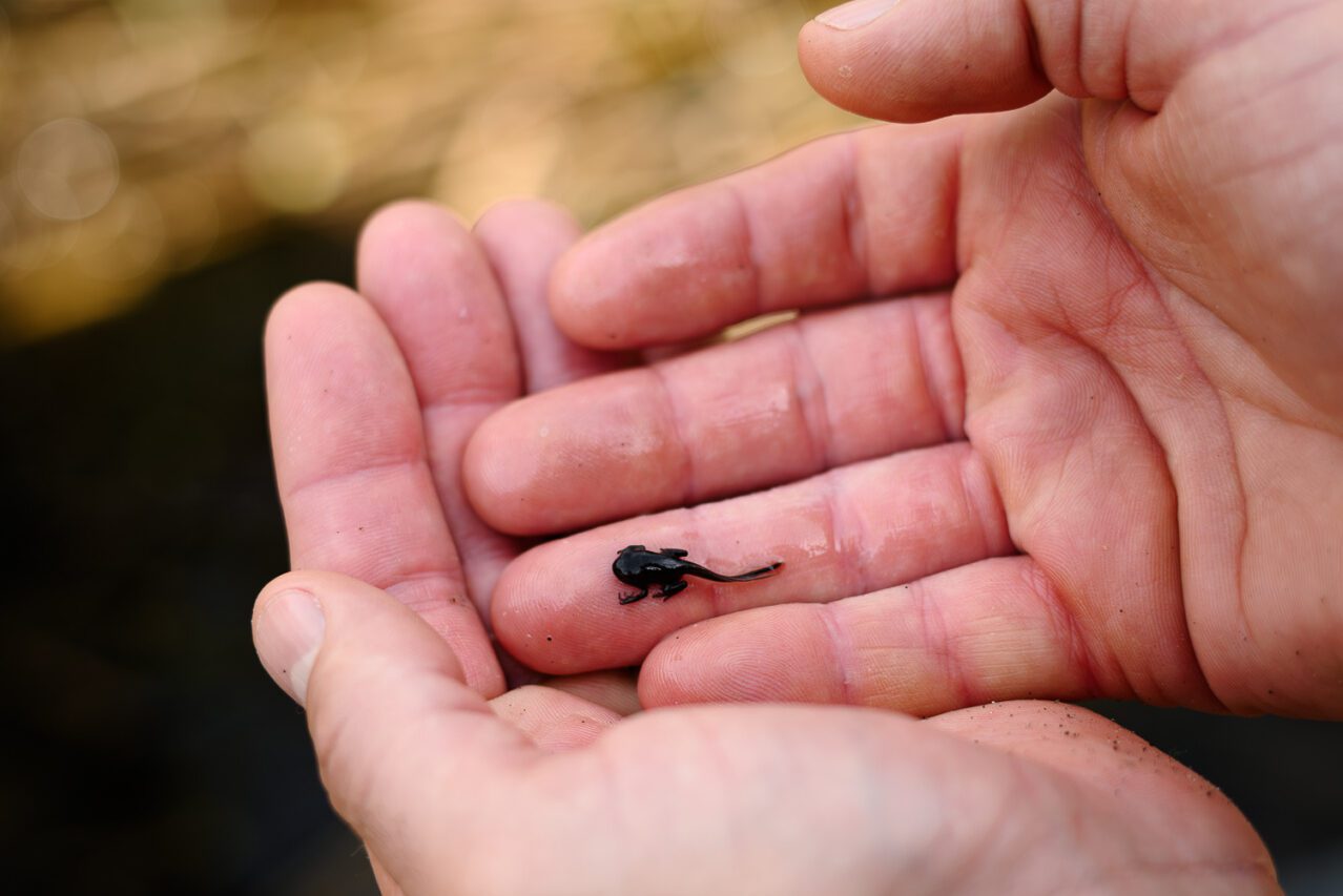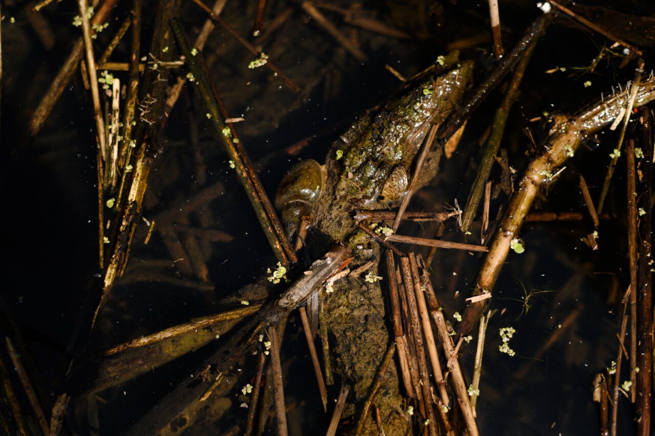 Ook de bever voelt zich er prima thuis. Regelmatig passeer ik knaagsporen op de wilgenbomen. De bever zelf, net als de schuwe reeën, laten zich vandaag niet zien. De route slingert door het moerasachtige gebied. Brede loopplaten overbruggen de vele waterpartijen. Bij een poeltje blijf ik staan om te kijken wat zich onder water bevind. Kikkervisjes met al kleine pootjes eraan schieten door het water.