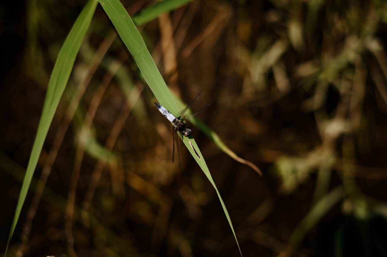 Poelslakken kruipen gracieus over een paar takken. Een blauwe libelle blijft trillend hangen aan het riet. Het is een Platbuik libelle. De gele lis en valeriaan doen een wedstrijdje wie de mooiste bloemen kan produceren. Voor mij zijn ze allebei winnaars.