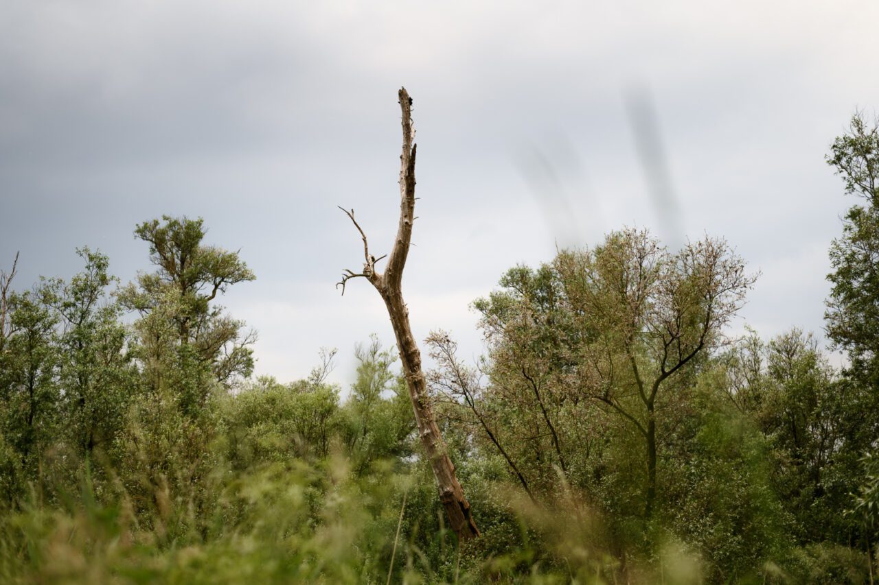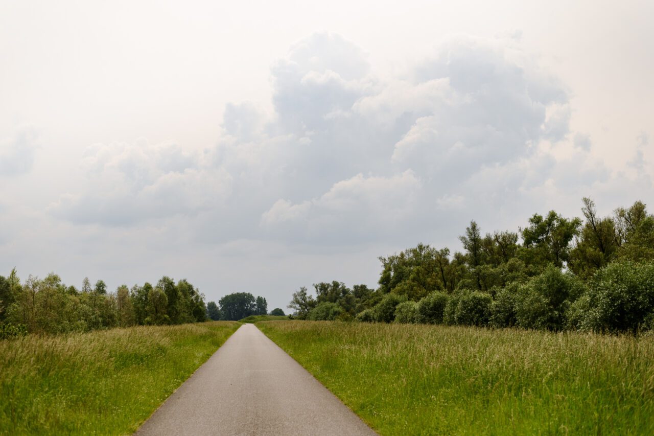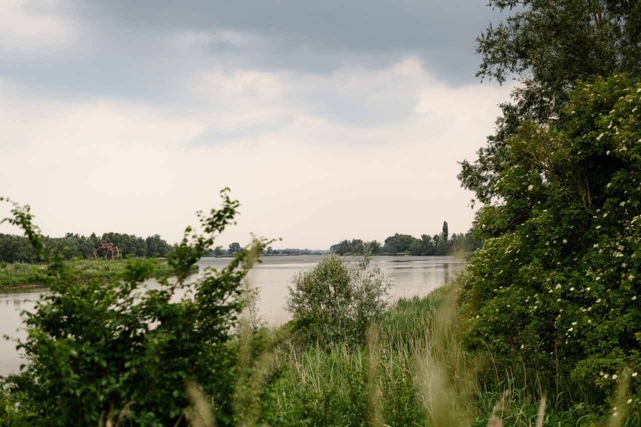 Nog even naar het toilet, slok water en dan begin ik aan de route. Het heeft geregend en de zon begint door te breken. Later op de dag voorspellen de weerberichten onweer. Ik passeer ‘De Pannekoek’, een griend wat bij het museum hoort en waar wilgen nog geknot worden voor gebruik. De neuzen van mijn schoenen worden kletsnat door het hoge gras. Algauw duikt de route de bosjes in en voert verder door de Kleine Noordwaard. Hier maak je kans om waterbuffels aan te treffen in het water.
