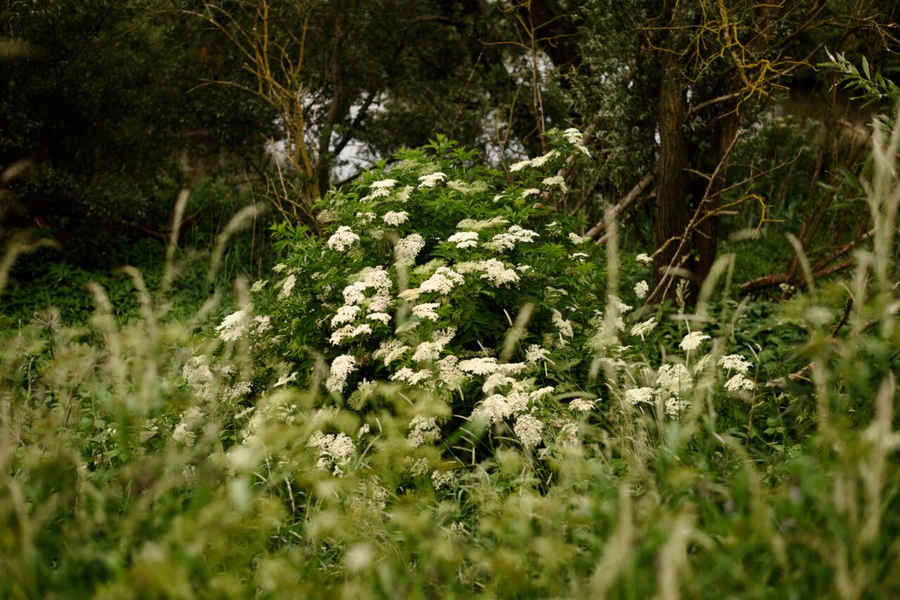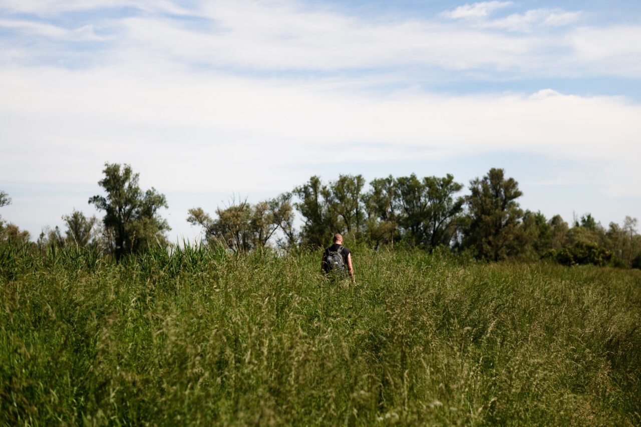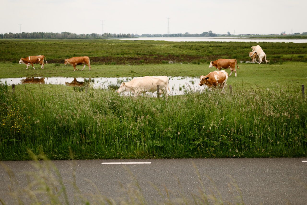 Nog even naar het toilet, slok water en dan begin ik aan de route. Het heeft geregend en de zon begint door te breken. Later op de dag voorspellen de weerberichten onweer. Ik passeer ‘De Pannekoek’, een griend wat bij het museum hoort en waar wilgen nog geknot worden voor gebruik. De neuzen van mijn schoenen worden kletsnat door het hoge gras. Algauw duikt de route de bosjes in en voert verder door de Kleine Noordwaard. Hier maak je kans om waterbuffels aan te treffen in het water.