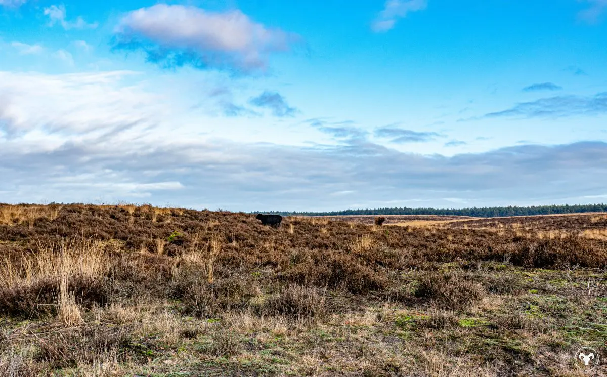 Wij volgden de groene route naar rechts met links de Grote Heide. Je wordt dan verwend met een grote diversiteit aan landschappen op een redelijk klein terrein. Uitgestrekte velden, met daarin Schotse Hooglanders, worden ingeruild voor dennenbossen met spannende doorkijkjes. Dorre velden en felgele vlaktes geven je het gevoel in een onbekend buitenland te zijn beland.