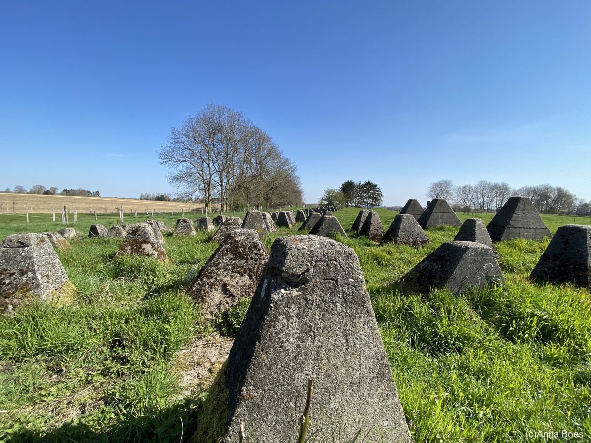 We komen regelmatig een grenspaal tegen en we zien de bijzondere restanten van de Westwall. Deze Siegfriedlinie is in de jaren dertig gebouwd. Een zeshonderd kilometerslange grensversterking bestond uit duizenden bunkers, muren en zogenaamde drakentanden. Deze laatste zien we af en toen op deze tweede wandeldag.