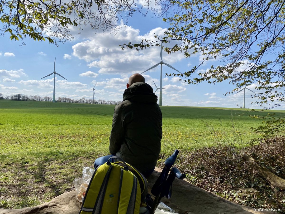 Het Duitse landschap is bezaaid met hoge windmolens. We zien ze van verre al liggen, al wandelend komen ze steeds dichterbij en uiteindelijk laten we ze ver achter onze wandeldagetappe van Kerkrade, door het Duitsland, naar Vaals.
