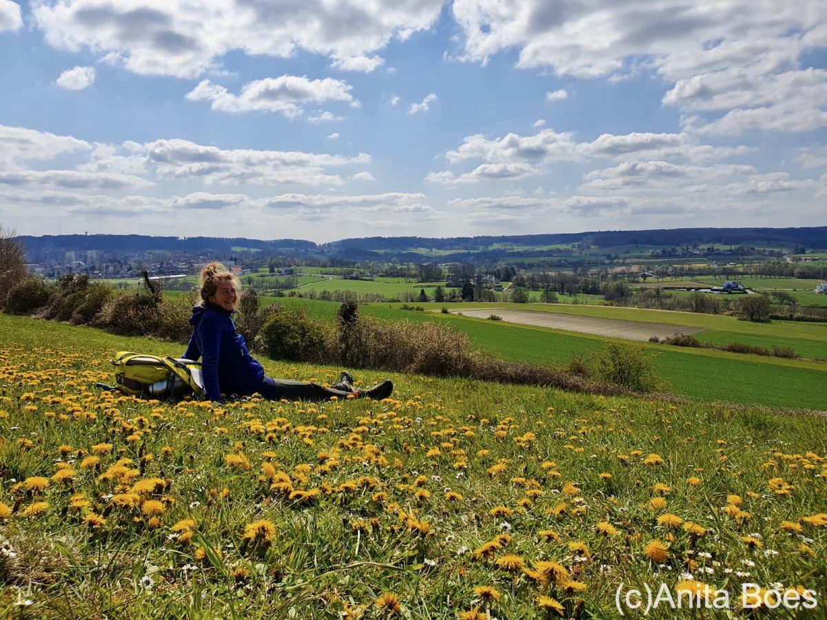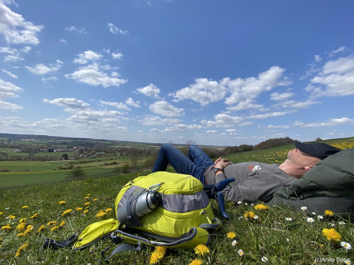 Omdat we deze dag ruim de tijd hebben en onze eindbestemming Vaals al zien liggen, besluiten we om lekker een uur op de ‘alpenweide’ tussen de paardebloemen een dutje te doen en te genieten van het uitzicht op het dal.