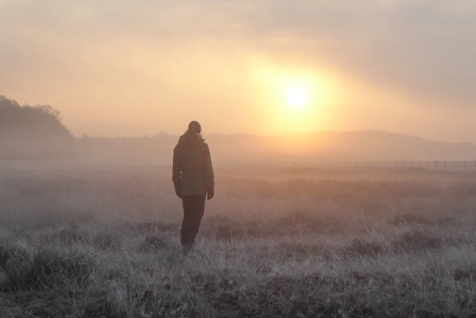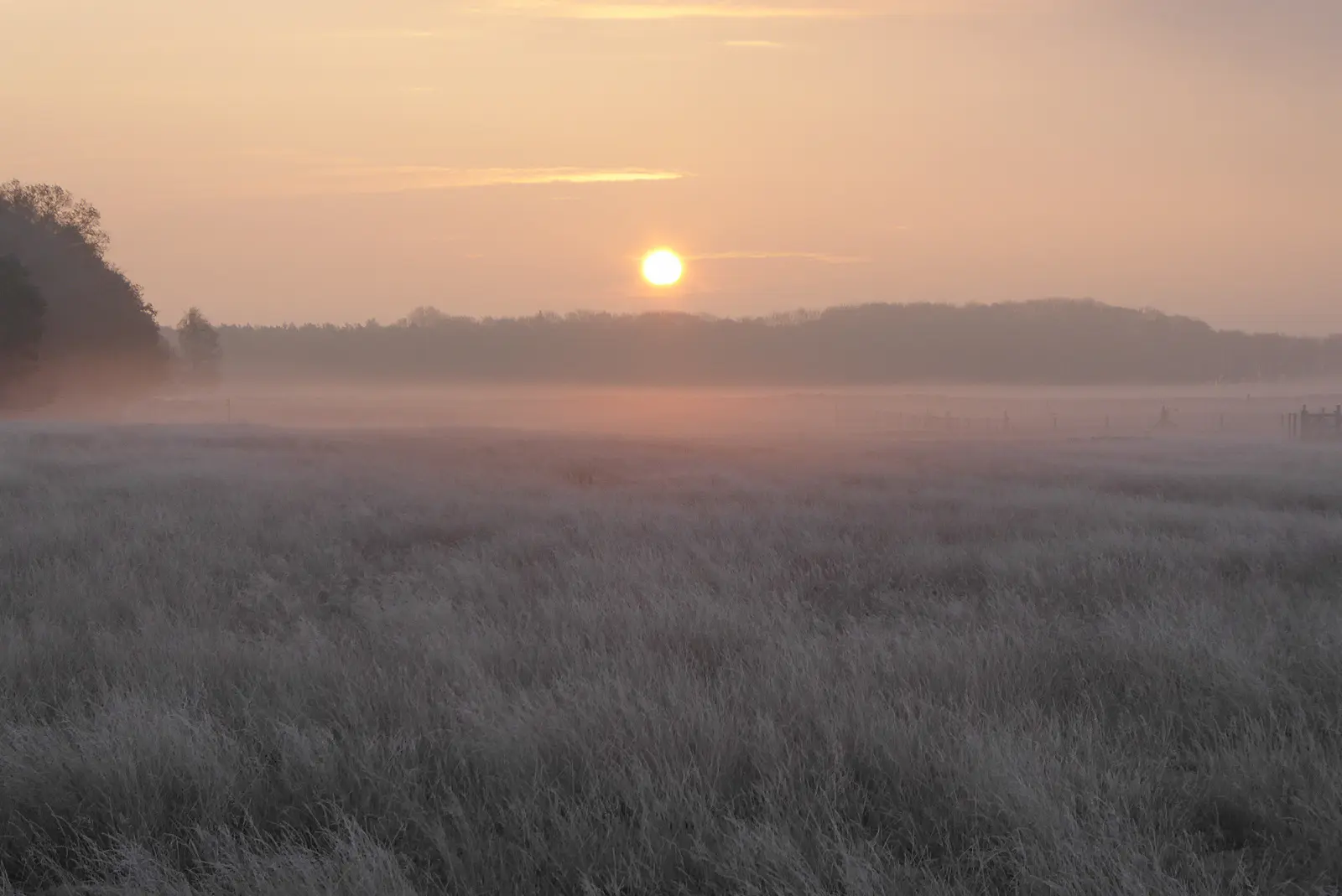 Ik loop over de mistige heide en ik hoop eigenlijk de zonsopkomst mee te maken. Of eigenlijk bedoel ik iets van een gekleurde lucht. Met dit ijskoude weer kan de horizon prachtig zijn als de zon net opkomt. Als ik halverwege de heide ben merk ik dat het licht verandert. Ja hier had ik op gehoopt!