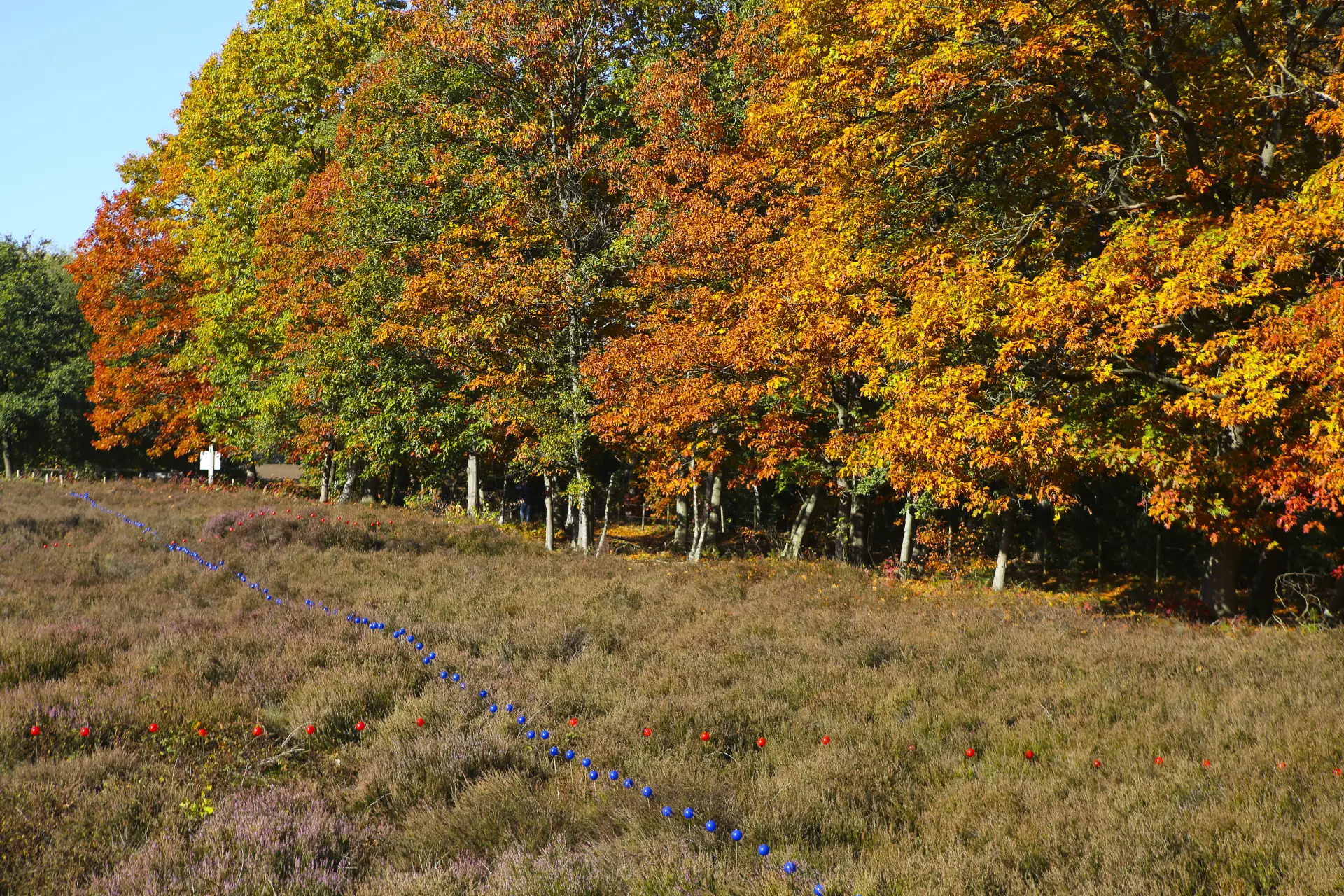 Zo laat de installatie van Heidi Linck ons zien waar de scheidingslijnen van de prehistorische kavels van de “Celtic Fields” liggen. Kleurige bolletjes sieren het veld, en zo weten wij waar de grenzen van de prehistorische akkers lagen.