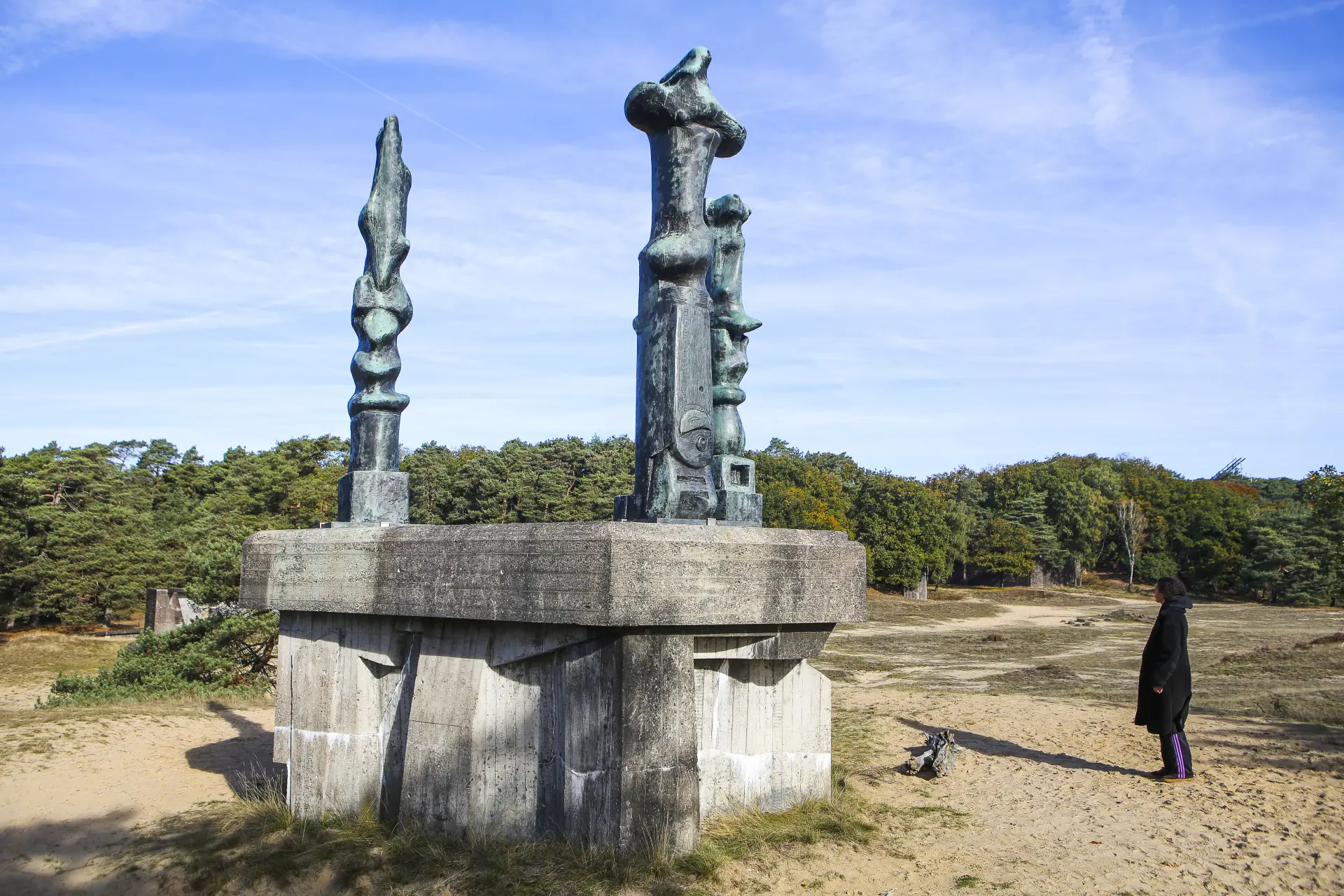 We stoppen bij drie opmerkelijke totem-achtige beelden, gemaakt in 1955 door Henry Moore, die boven het landschap uitsteken. Daarachter, tegen de “Franse Bergen”, zoals ze worden genoemd, dachten we bunkers te zien maar het blijken de oorspronkelijke eerste bouwsels van het Kröller-Müller Museum te zijn. Door geldgebrek in 1921 is de bouw nooit voltooid. Lees verder in deel twee van mijn reisverslag.