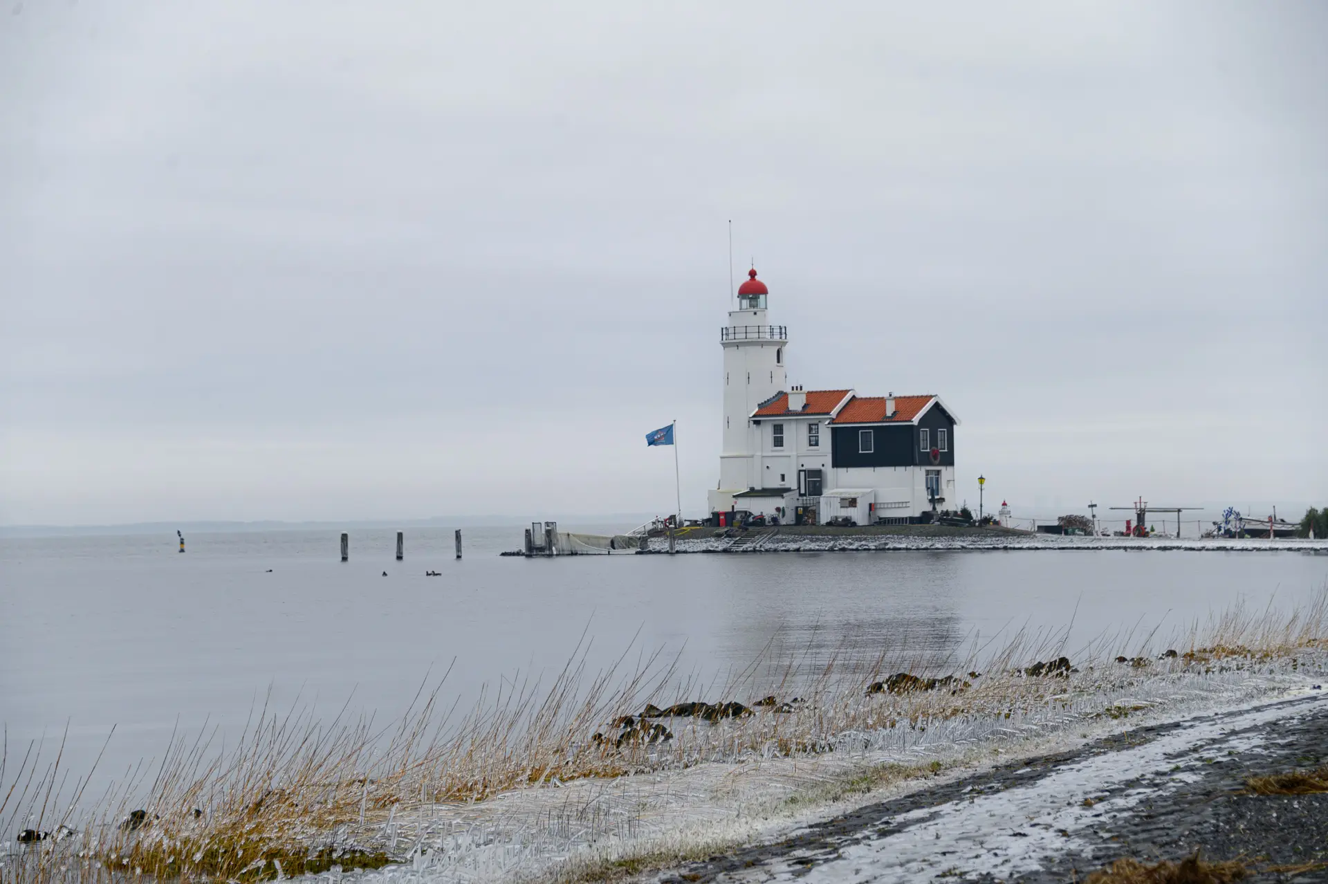 Onderweg loop je langs Nederlands meest gefotografeerde vuurtoren, Het Paard van Marken. Vroeger waarschuwde deze met zijn lichten de scheepvaart, inmiddels is dat overbodig geworden. Wel is de vuurtoren woning bewoond. Het heeft zo hard gevroren de laatste dagen dat het ijs alles bedekt heeft. Er drijven schotsen rond de vuurtoren en langs de kust zijn er prachtige kunstwerken gevormd. In 1971 kruide het ijs van het Markermeer zo hoog op dat de vuurtoren enkele centimeters van zijn plek schoof!