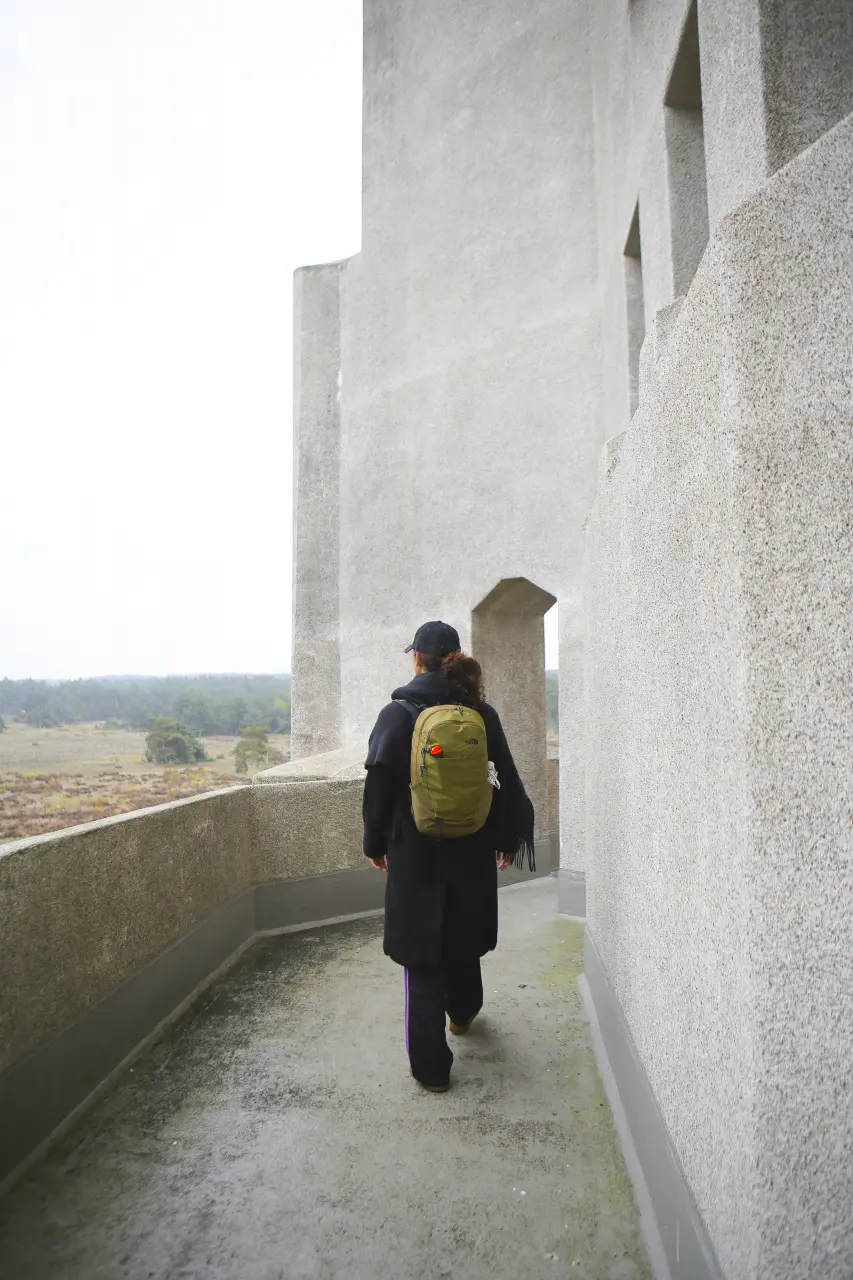 We bevinden ons nu halverwege het Nationale Park De Hoge Veluwe, bijna aangekomen bij de ingang van het Kröller-Müller museum. Tijdens een wandeling startend bij de drie totembeelden van Henry Moore, spotten we nog iets opmerkelijks. Vanuit de verte zien wij een trap boven de bomen uitstijgen, en dit blijkt later één van de kunst-installaties van de Kröller-Müller beeldentuin te zijn, gemaakt door Krijn Giezen.